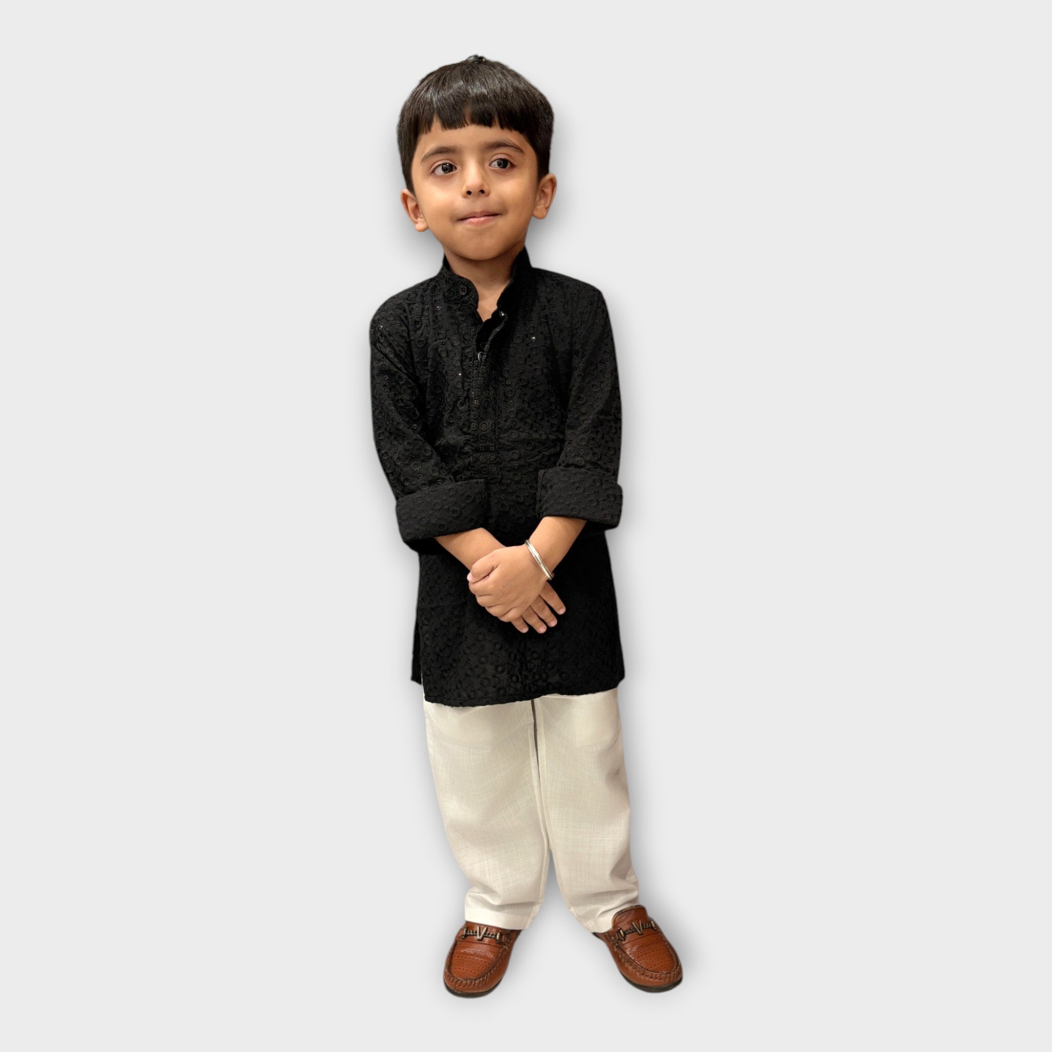 Give your little one a stylish and timeless look with this black kurta pyjama set for boys, featuring a rich textured design and comfortable fit. Perfect for weddings, festive celebrations, birthday parties, and family gatherings. A versatile ethnic outfit that adds elegance to every occasion.