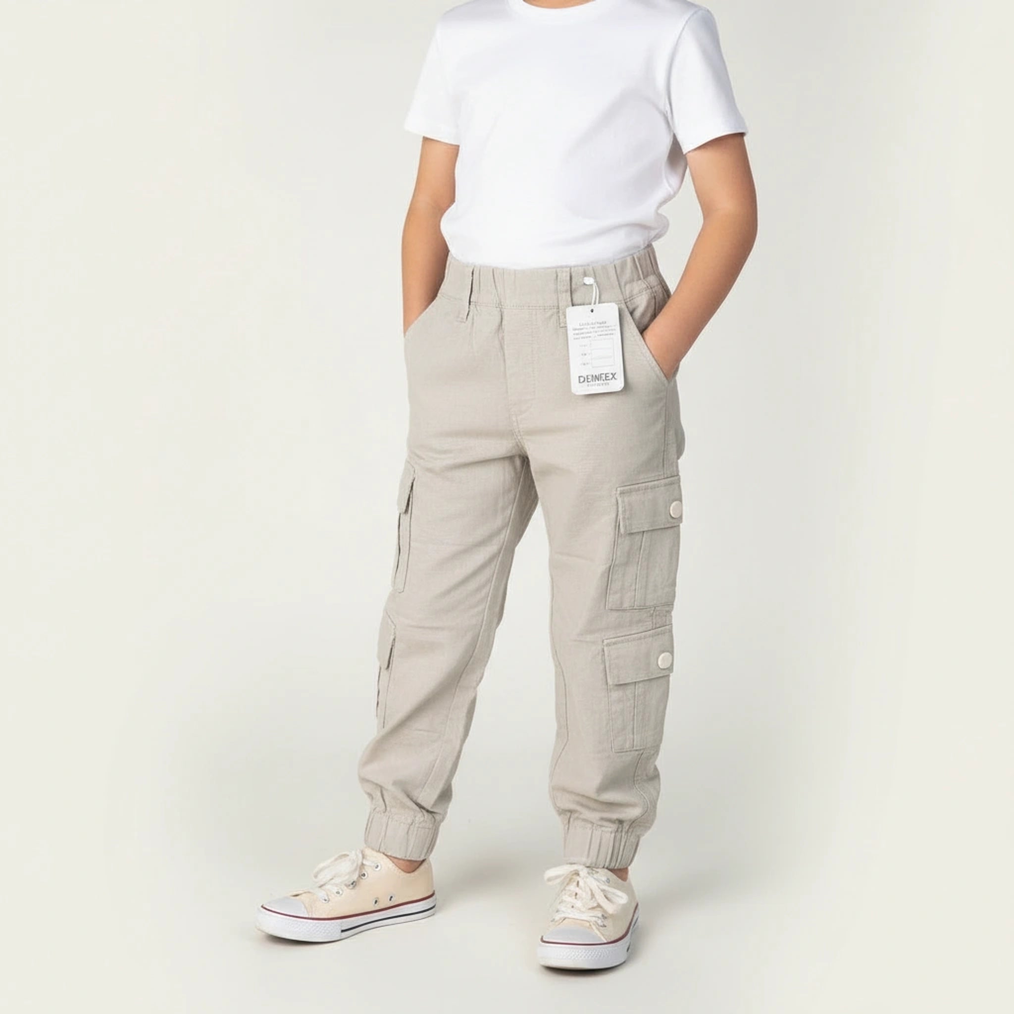 Trendy cargo pants for boys with side pockets & elastic waist. Perfect casual wear for school, playtime & outings. Soft, durable & comfy fit.
