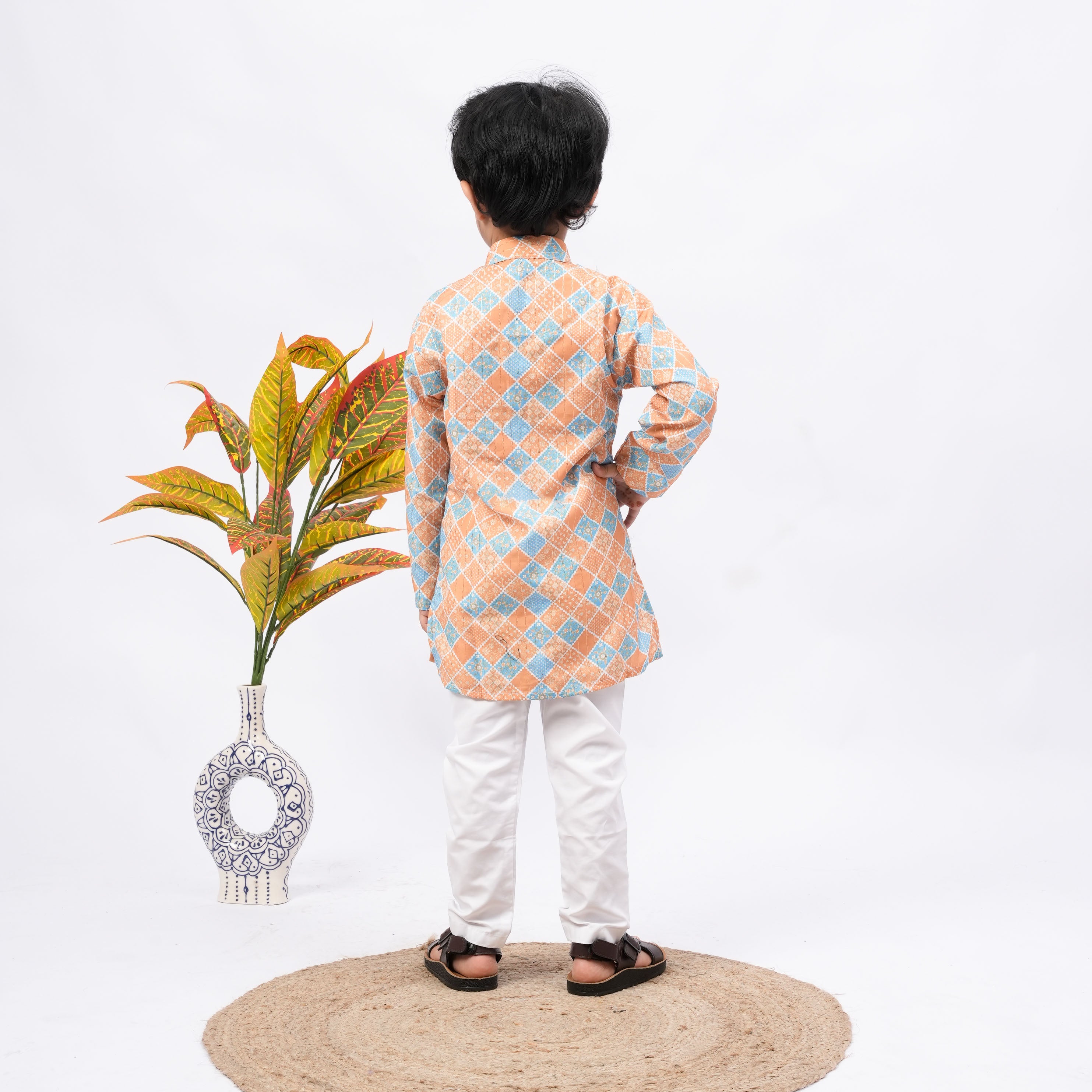 Give your boy a vibrant festive look with this Boys Orange & Blue Printed Kurta Pajama Set. Featuring a unique geometric print kurta in orange and blue hues, paired with a crisp white pajama, this set blends traditional elegance with modern style. The lightweight and breathable fabric ensures comfort for long hours of celebrations.