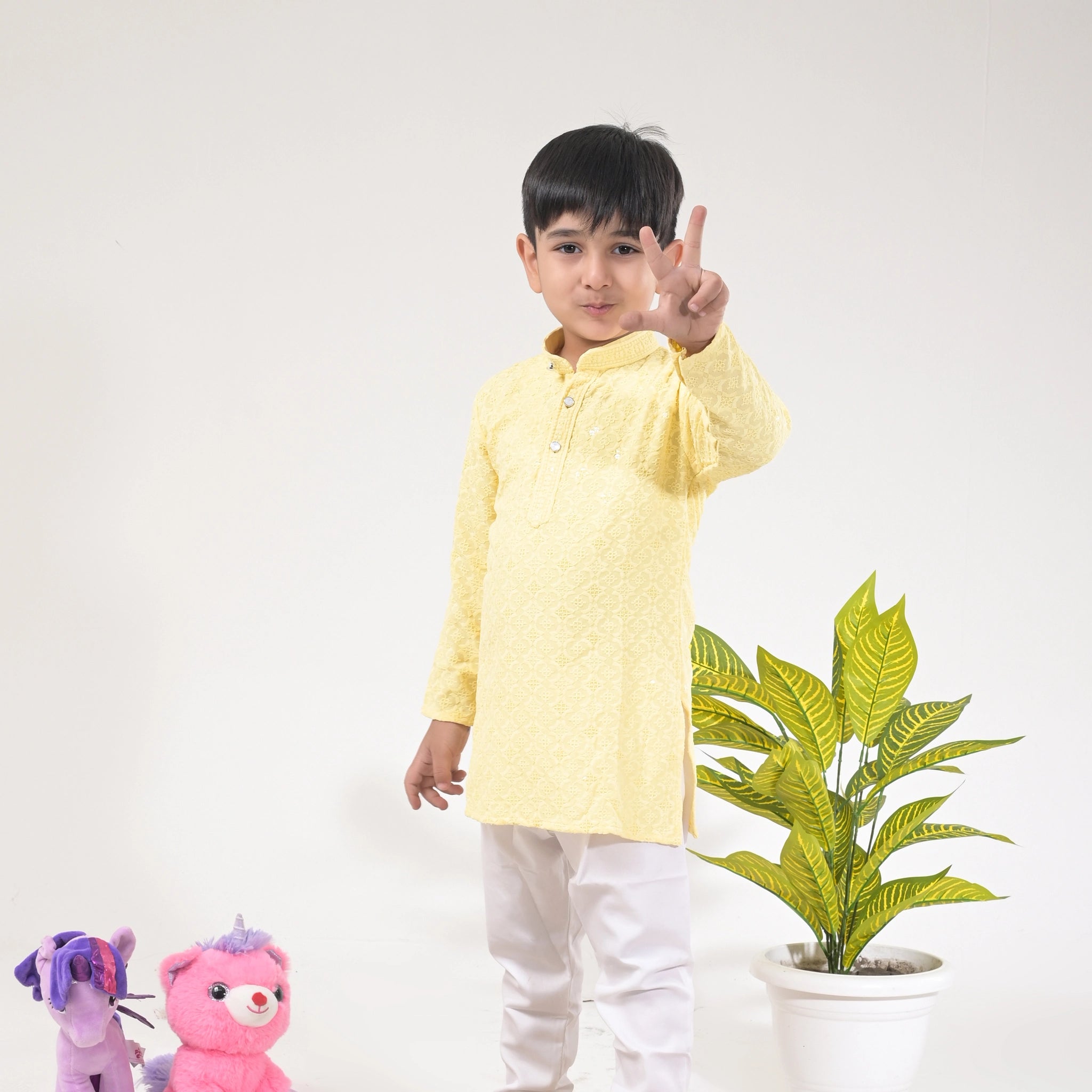 Add a cheerful touch to your boy’s festive wardrobe with this Boys Yellow Kurta Pajama Set. The bright yellow kurta features delicate embroidery with a buttoned neckline, paired with a crisp white pajama for a complete traditional look. Designed with breathable and soft fabric, it ensures all-day comfort for kids during weddings, festivals, and family gatherings.