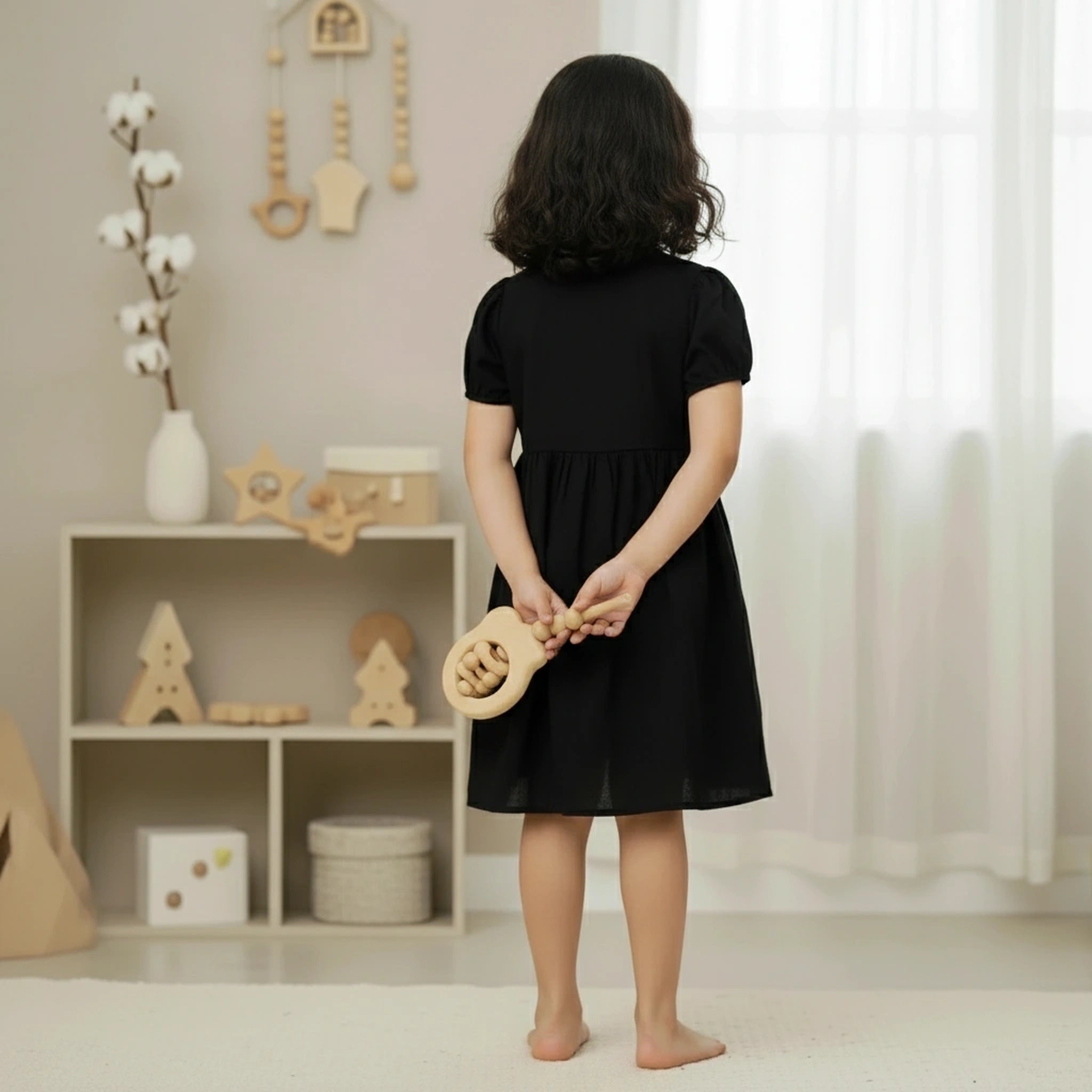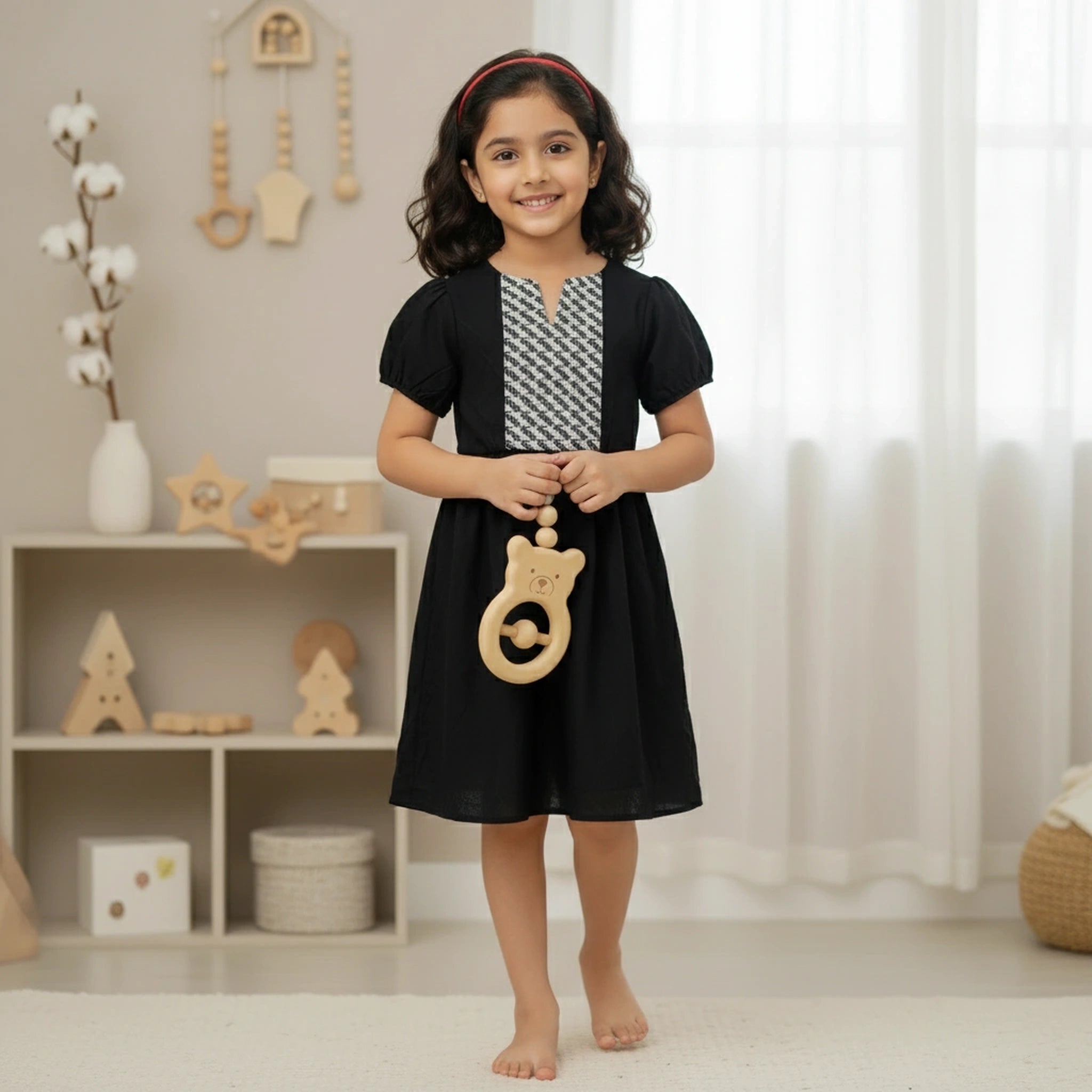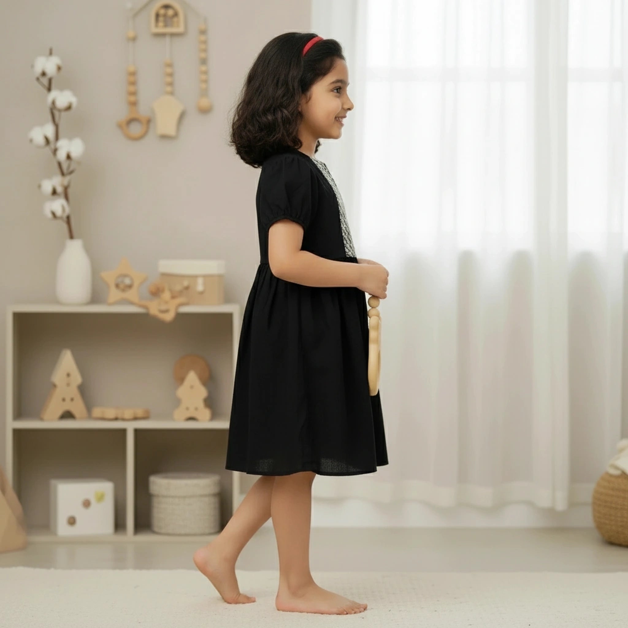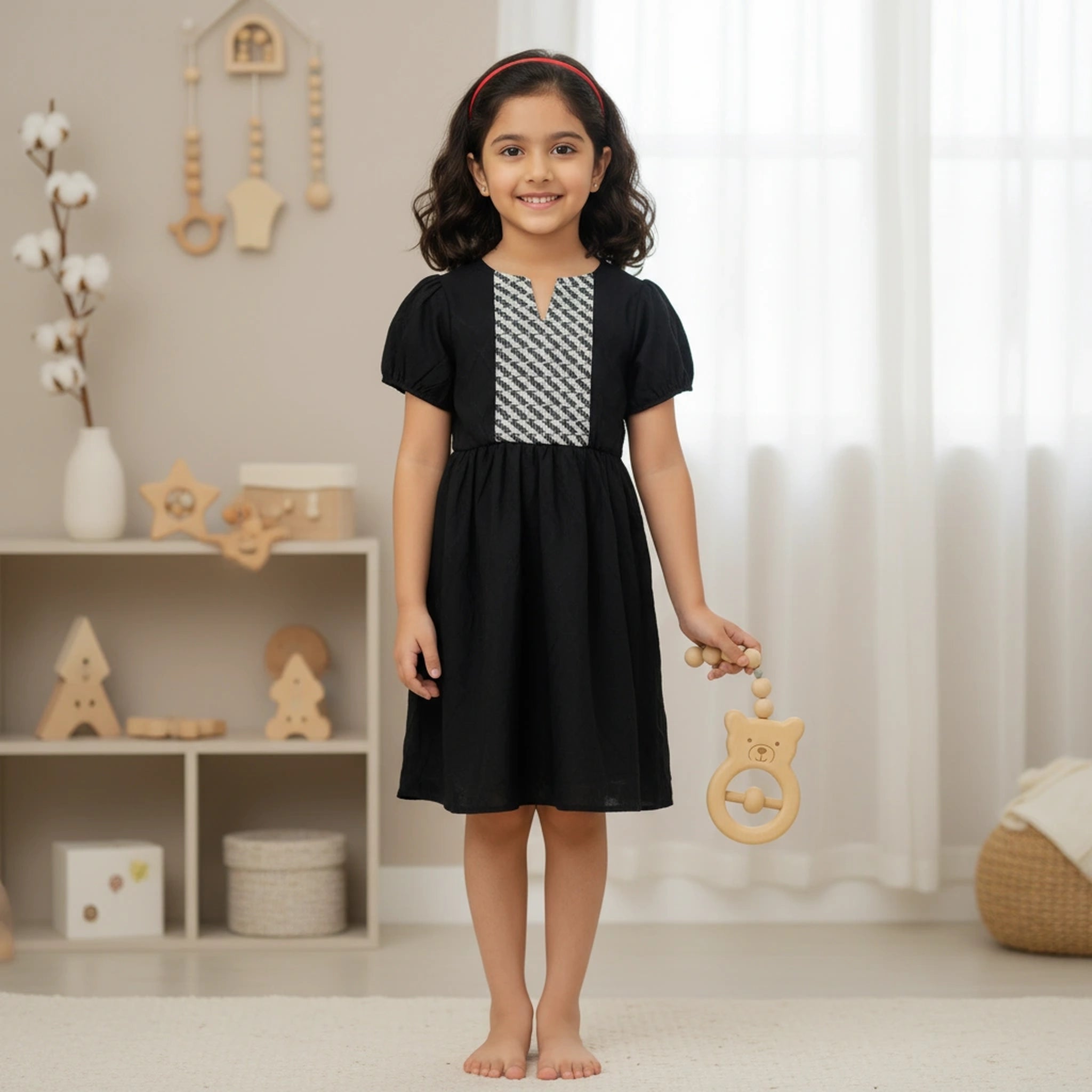 Elevate your little one’s style with our Embroidered Panel Frock for Girls, available in classic Black & White. Designed with puff sleeves and an elegant embroidered front panel, this frock offers the perfect balance of style and comfort. Crafted from soft cotton, it’s ideal for both special occasions and everyday wear.