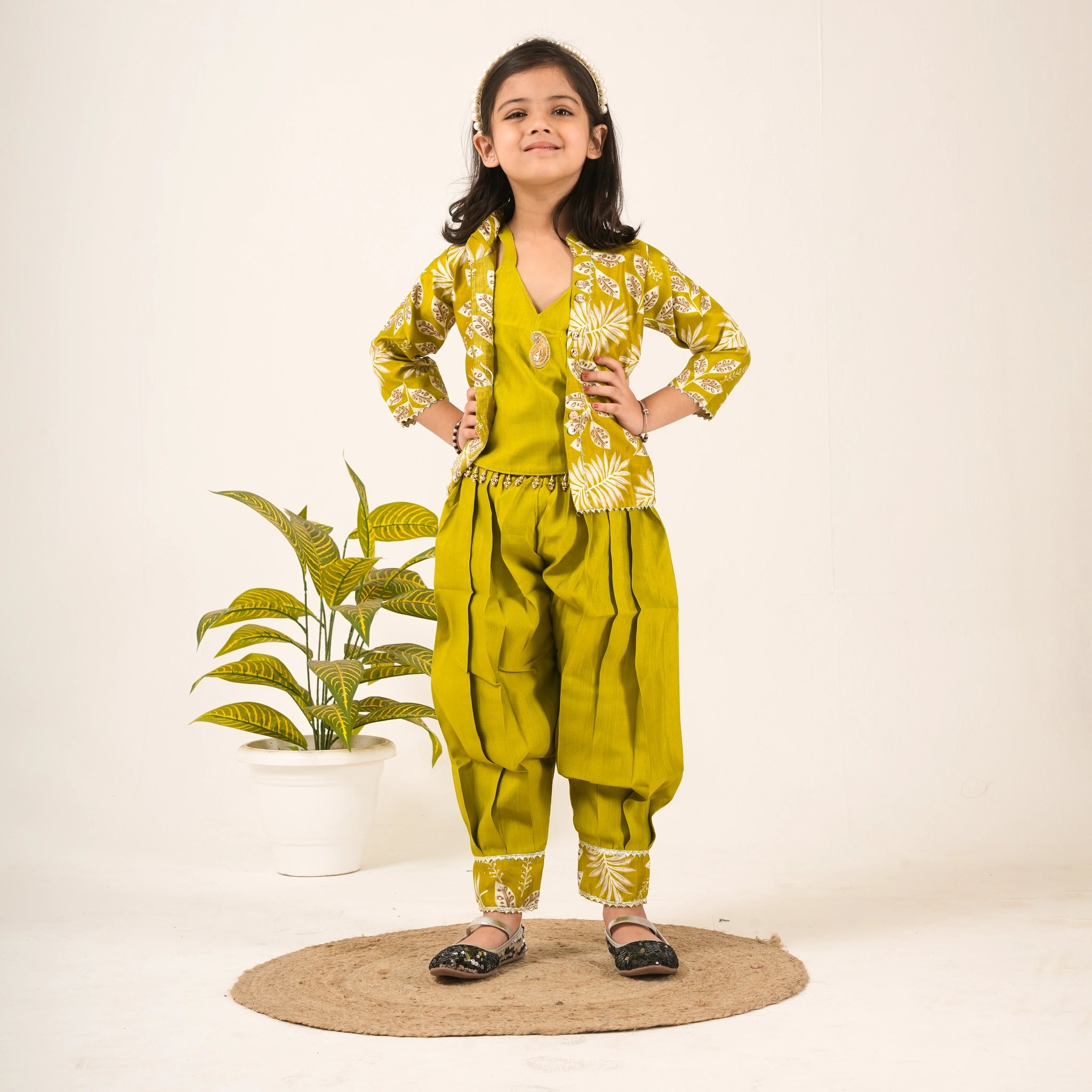 Trendy green dhoti style set with printed jacket for girls. Perfect ethnic wear for weddings, festive occasions, and cultural celebrations. Stylish, comfortable, and designer kidswear