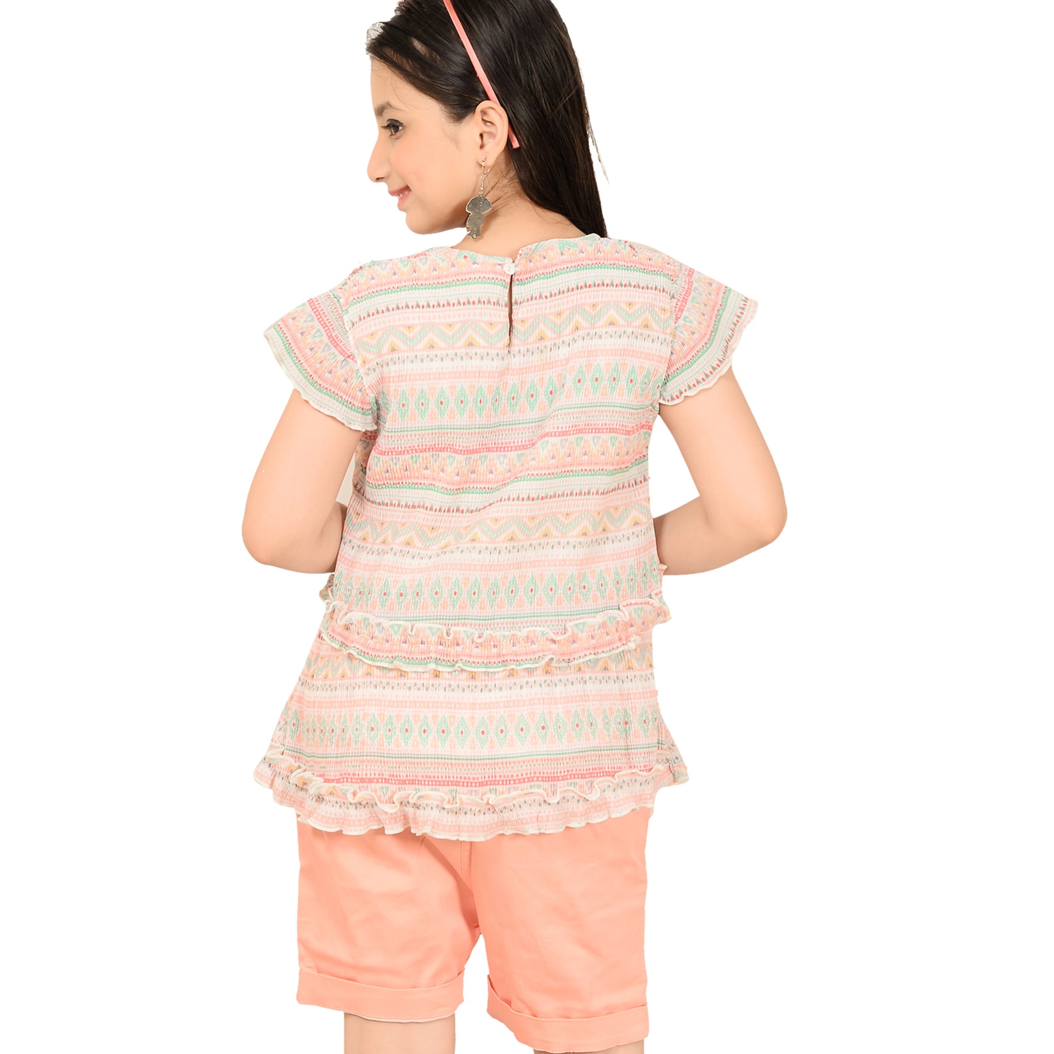 Brighten your girl's day with this cute everyday outfit! It features a pretty printed top and peach floral embroidered shorts—perfect for playtime, outings, or daily wear. Made with soft, breathable fabric to keep her comfy and cheerful all day long.