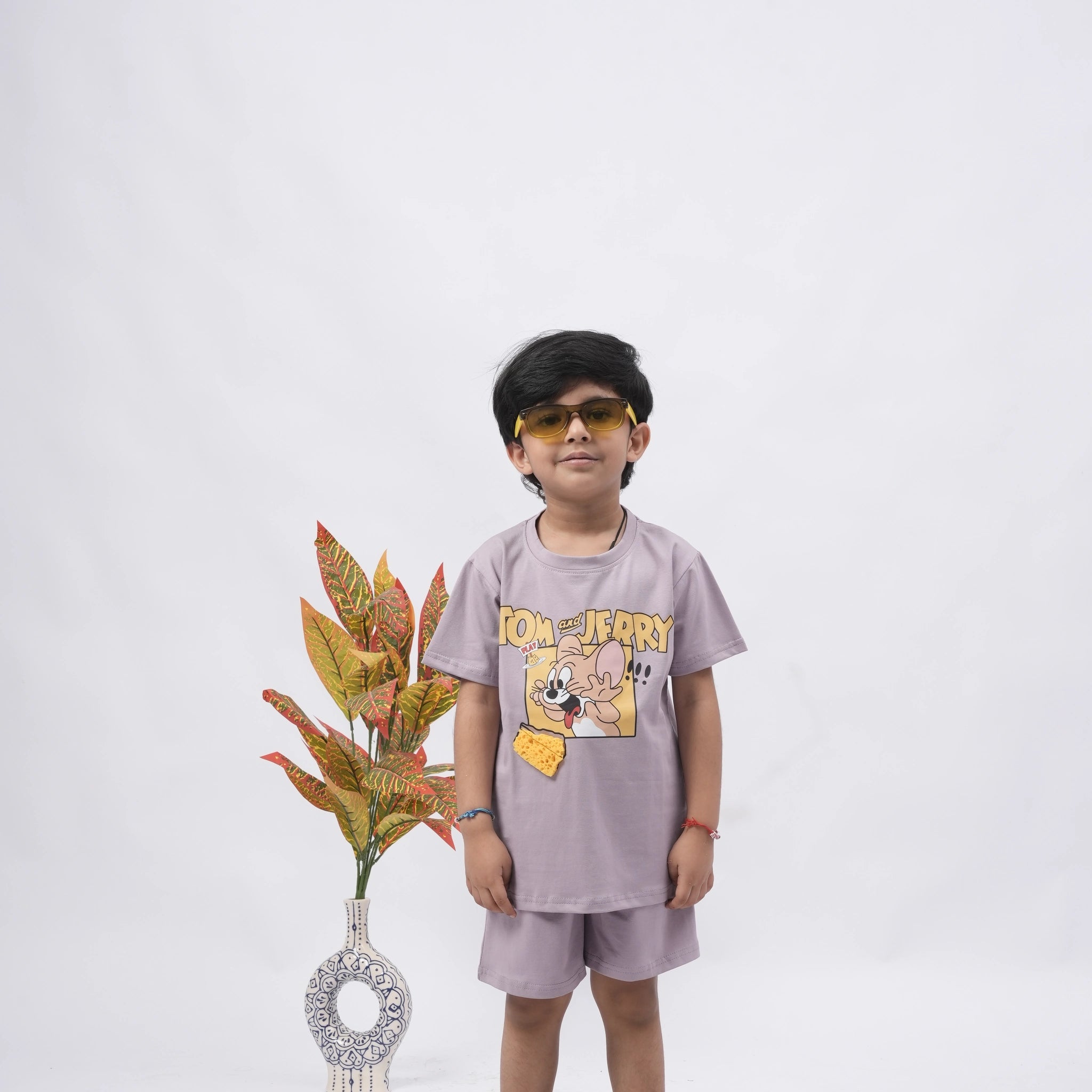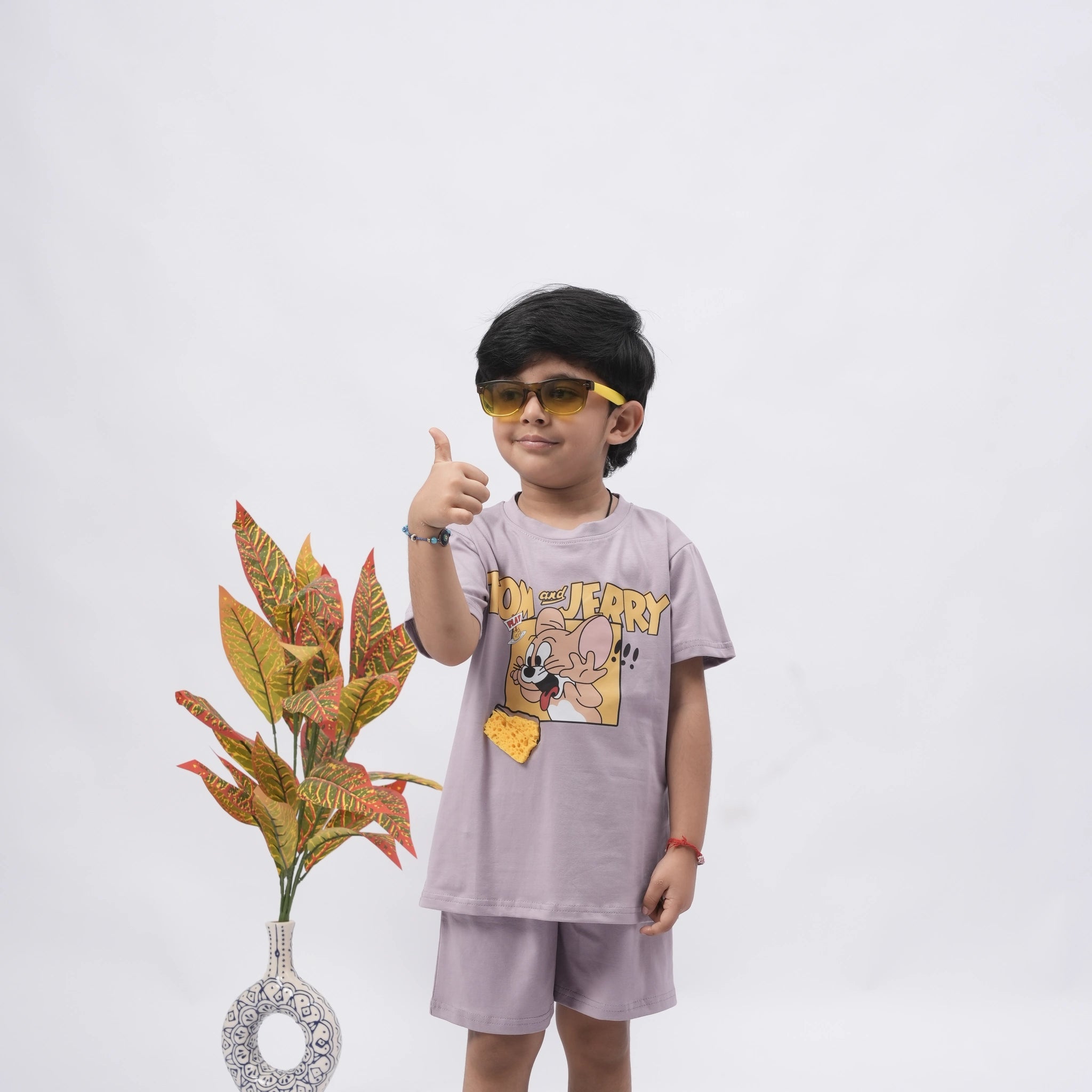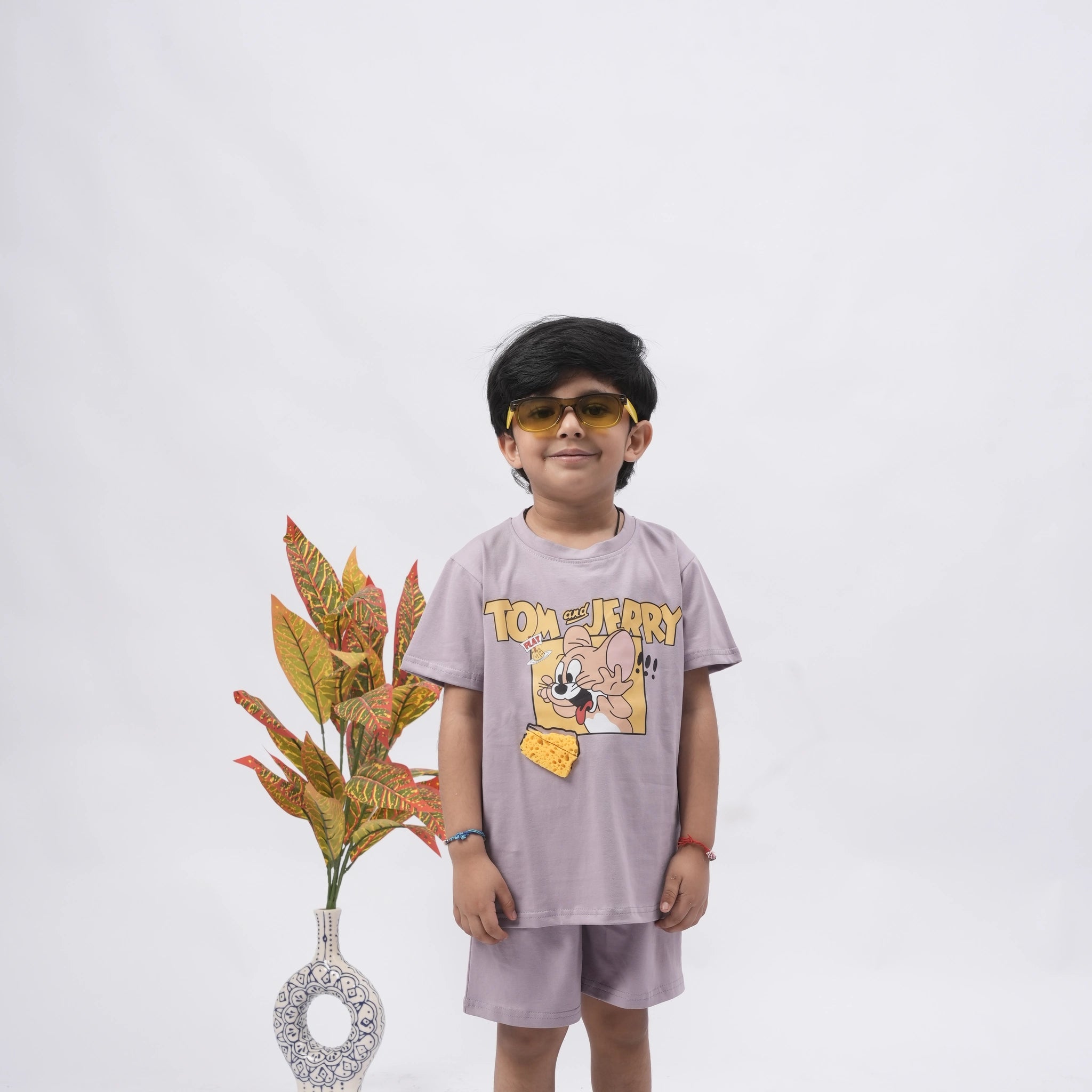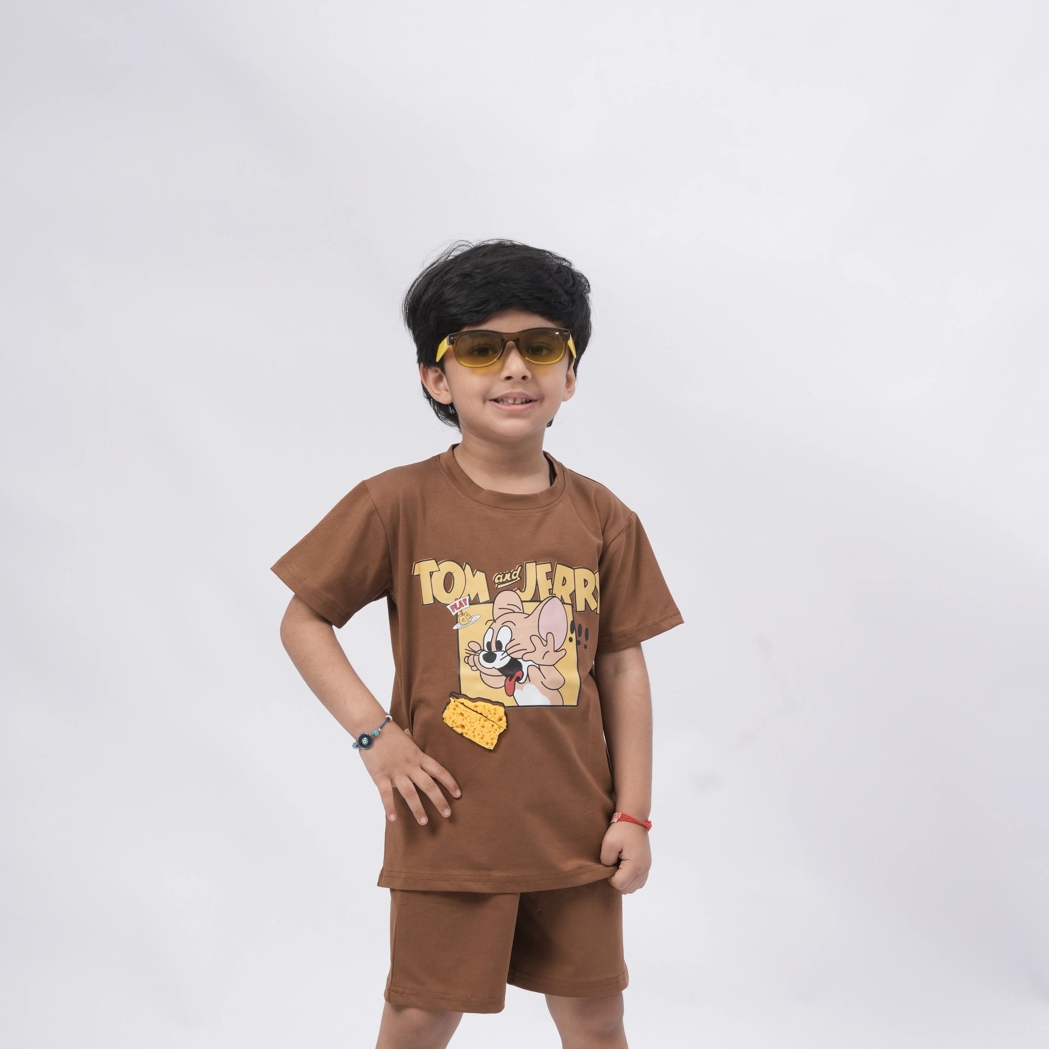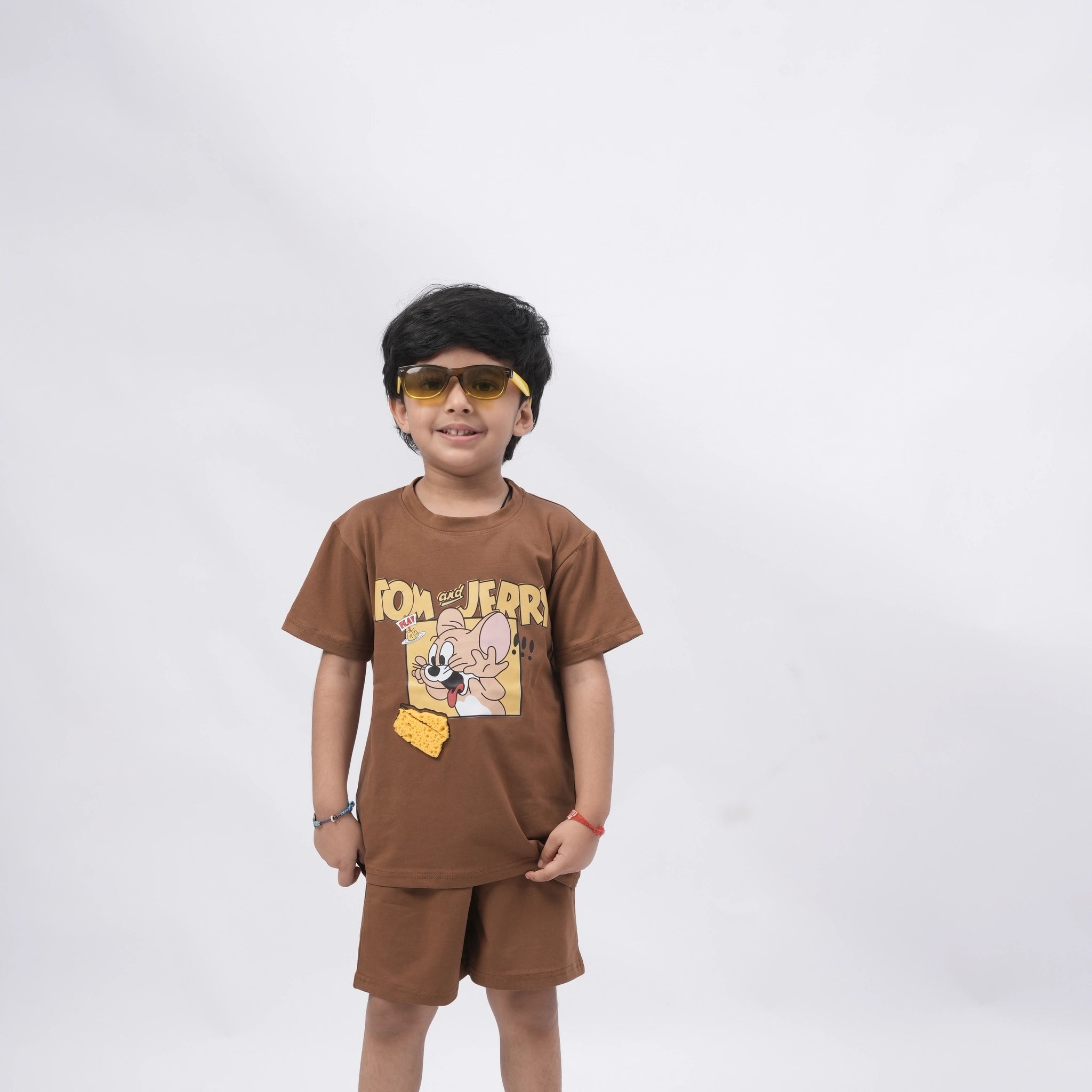 Let your little one shine in this Tom & Jerry kids coord set, featuring a fun printed t-shirt with matching shorts. Perfect for casual outings and playtime. Available in off white, black, purple, and brown.