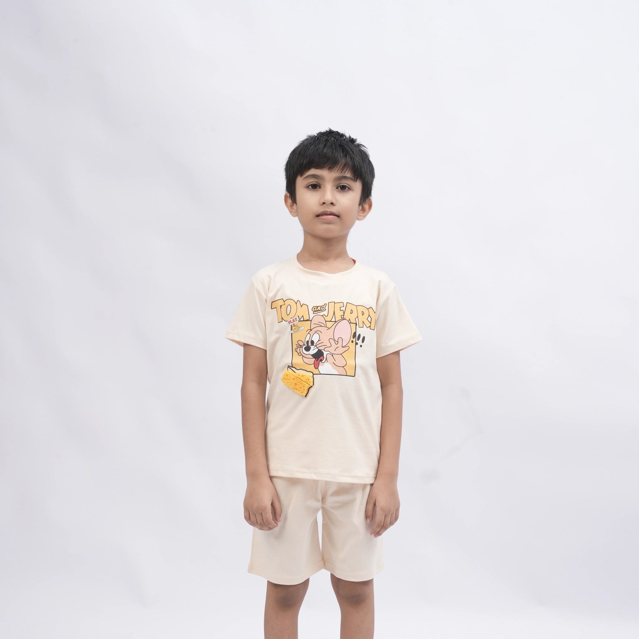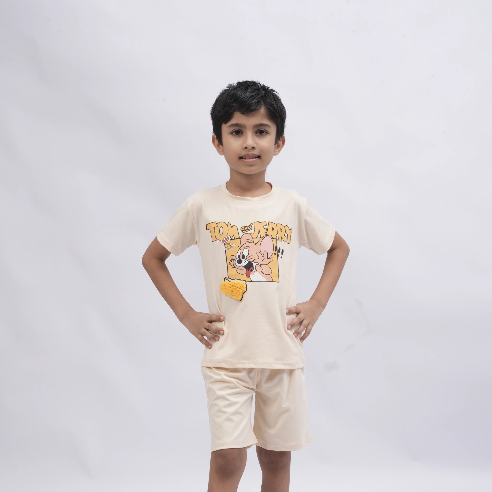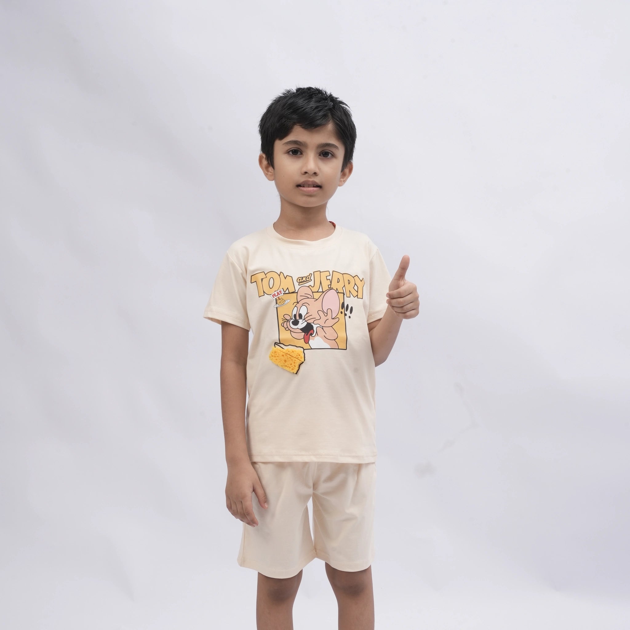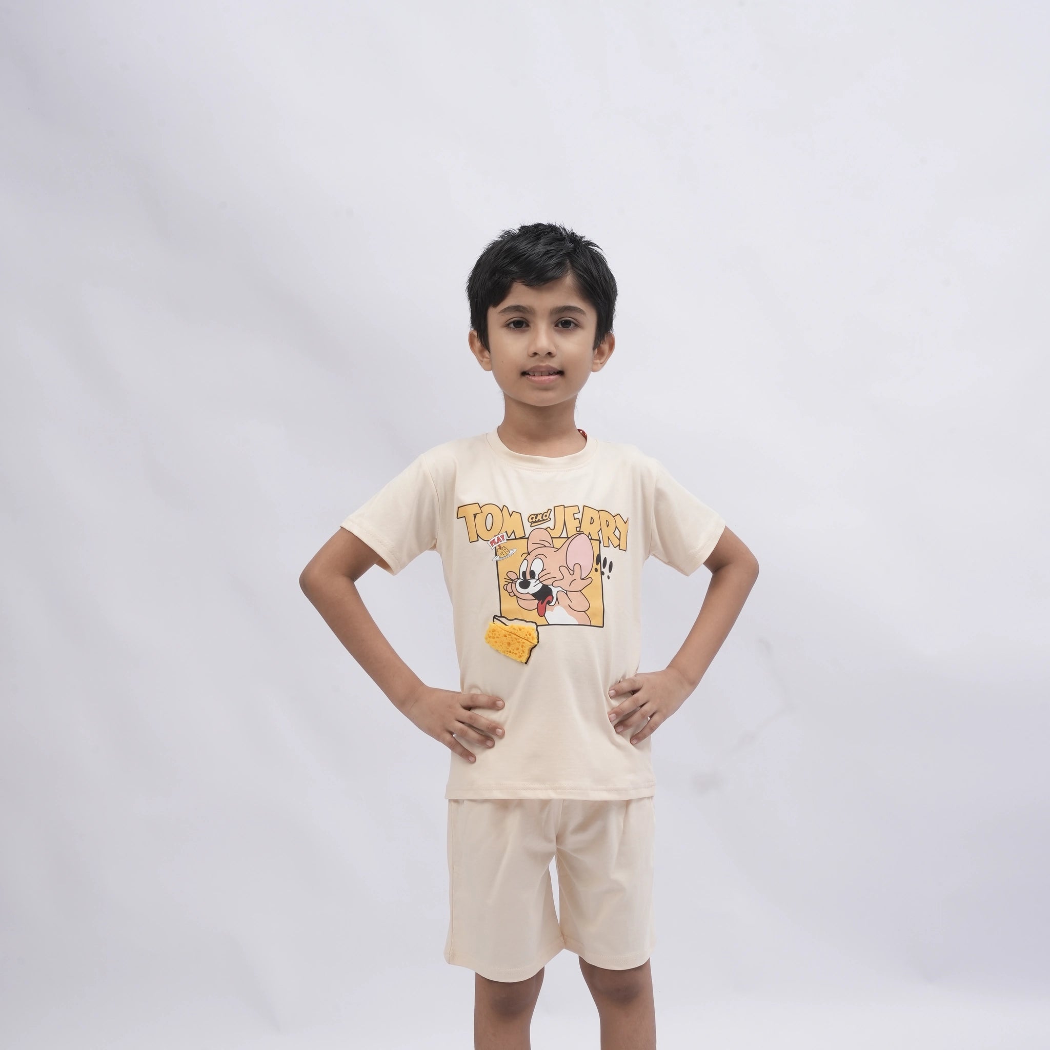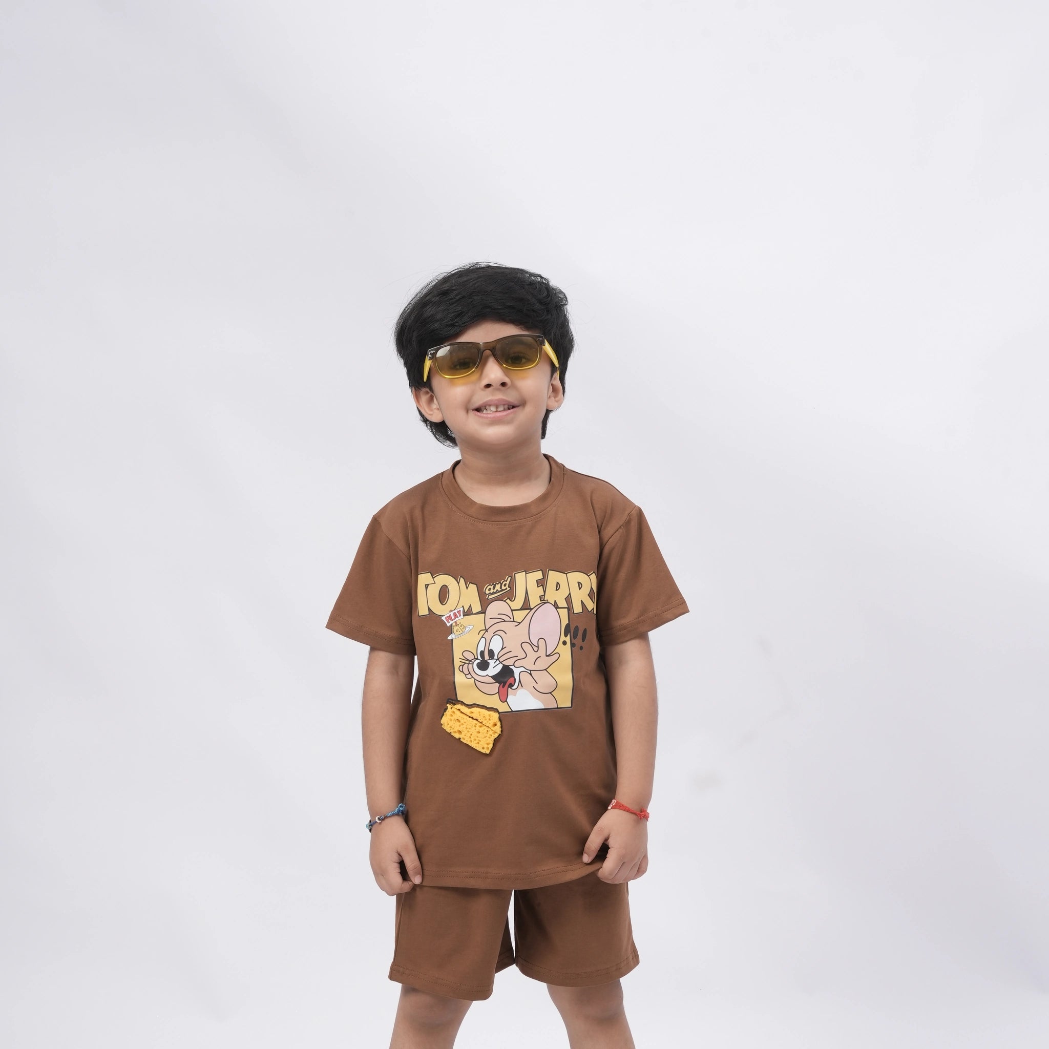 Let your little one shine in this Tom & Jerry kids coord set, featuring a fun printed t-shirt with matching shorts. Perfect for casual outings and playtime. Available in off white, black, purple, and brown.