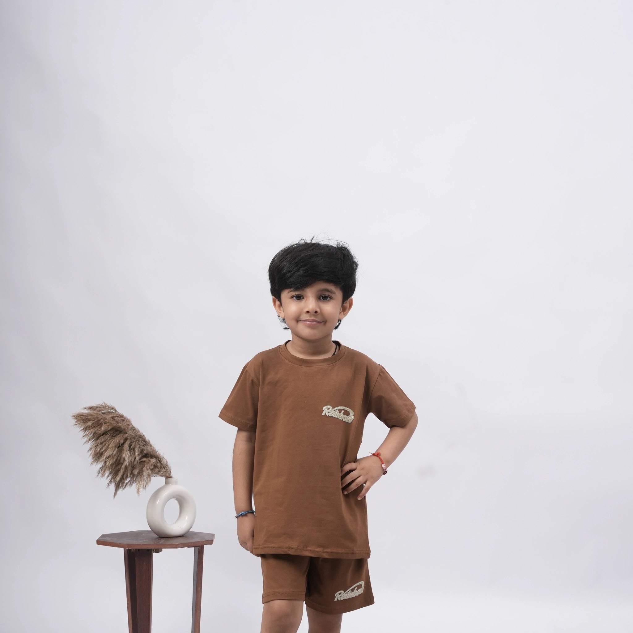 Shop this stylish kids coord set featuring a comfy t-shirt and shorts, perfect for everyday wear. Available in off white, purple, and brown. Soft, breathable fabric for your little one’s all-day comfort.