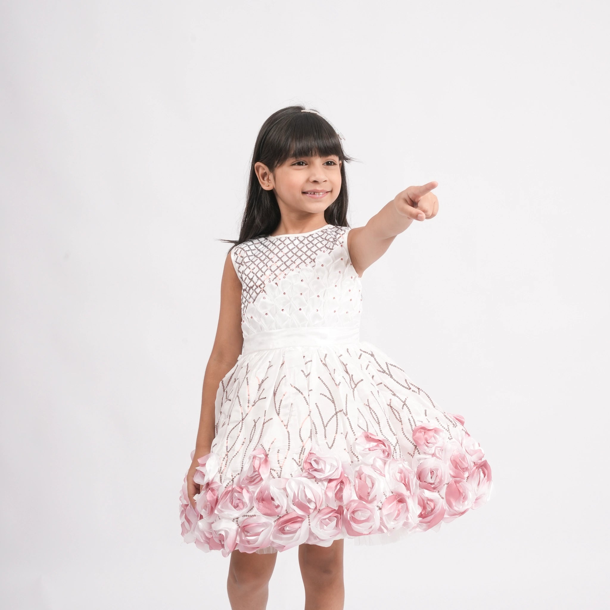 Make your little princess shine with this stunning sleeveless dress, designed with intricate detailing on the bodice and a flared skirt adorned with delicate pink rose embellishments. Perfect for birthdays, weddings, and festive celebrations, this dress combines style and comfort with its soft fabric and graceful fit. A must-have outfit to make every moment picture-perfect.